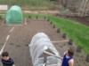 Here is half of the new patch with one hoop with about 670 square feet and the tomato hut. My two sons are in this photo as they are home from college for the summer.