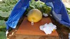 Two heavy cucumbers starting to vine. 96.5 Hunt Rudabaga in the background. I'm out of the 150 contest. Manage to kill the plant.