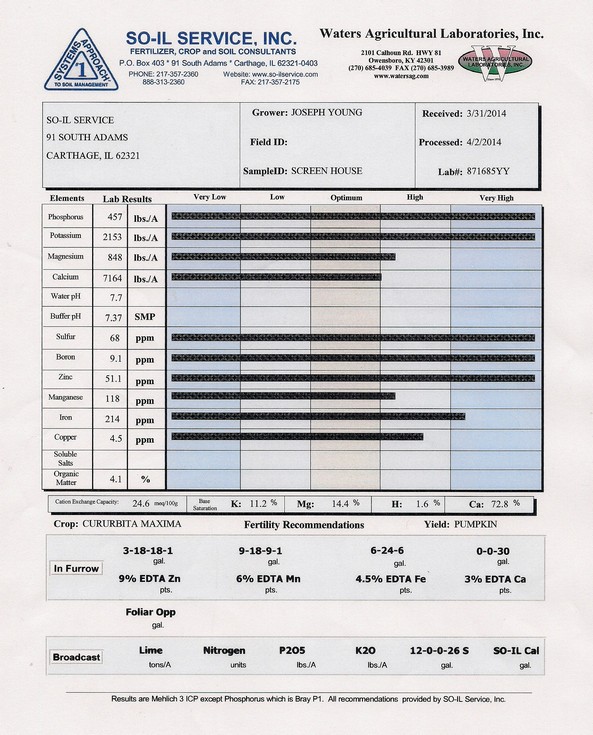 Screen House soil test. I don't think I'll need to do much in the way of extra feeding this year with everything way up. I introduced about 500 pounds of shredded soy bean stuble last fall and the OM is still low. Funny I thought there was too much of it when I pulled samples,lol. Either way all the soil test have come back favorable in my book.