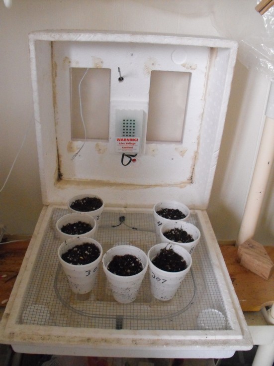 Rebuilt the egg incubator putting the coils in the bottom of the unit so the bottoms of the cups will warm up rather than just the tops. I took measurements last night and the top of the cups were at 95 - 97 degrees but the bottoms were incredibly in the upper 70's. Now the cups are 92.5 degrees all the way thru. Can't wait to see the results because in there I've got back ups going as follows 291 Kent melon, 297 Kent melon, 307 Bartoli melon and 2 401 Bucks'13 ( 1872 Wallace x 2009 Wallace).