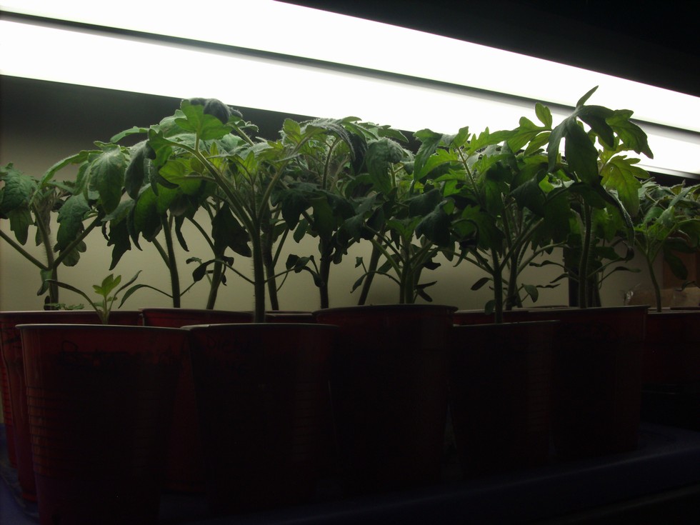 Other than two plants that I started approx two weeks ago the majority are maturing rapidly and are approx. five inches tall. I've been using a fan set on low speed for the past three weeks to strengthen the main stems of the plants and the result has been very thick main stems that will give the plant strength and resiliency when the time comes for transplanting.