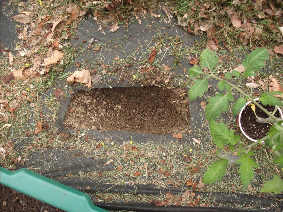 Here is a photo of the weed barrier cut and the planting trench dug.