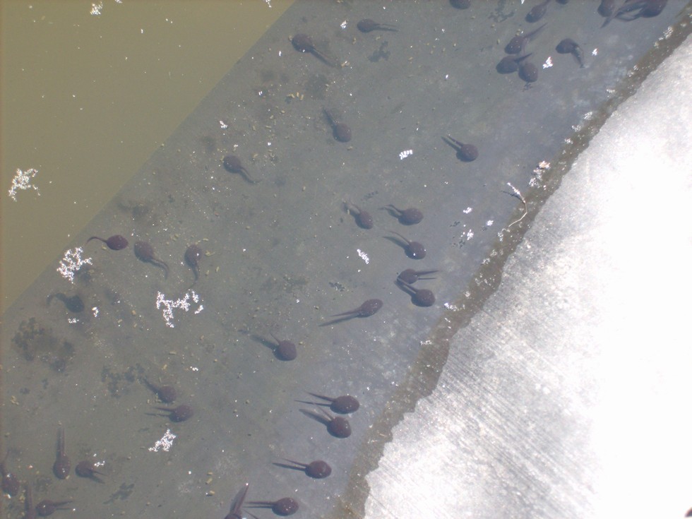 I'd say there's at least a couple of hundred tadpoles. Here's a photo of some of them at the edge of the pond hanging out.