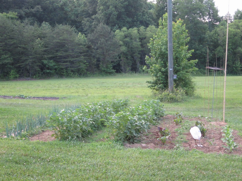 One little garden, taters, onion, some flowers, beans on the tower and a bamboo pole for my giant sunflower