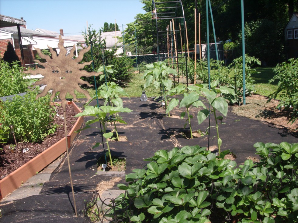 A photo of some of the sunflowers that are growing. The ones that you can see pictured are Mammouth and Giant strains. They both should grow from 12 to 15 feet in height. Comparatively to last season on this date the sunflowers are much taller.