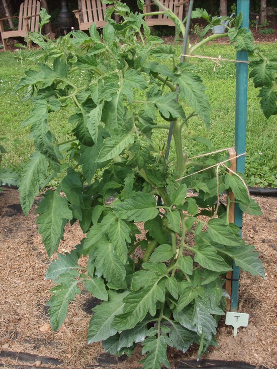 4.03 Diehl, tomato from a four fused bloom set approx. June 15th. Plant will eventually be pruned to a single stem. Currently a double stem due to a three fused bloom currently maturing on the other stem. It's always great to have options.