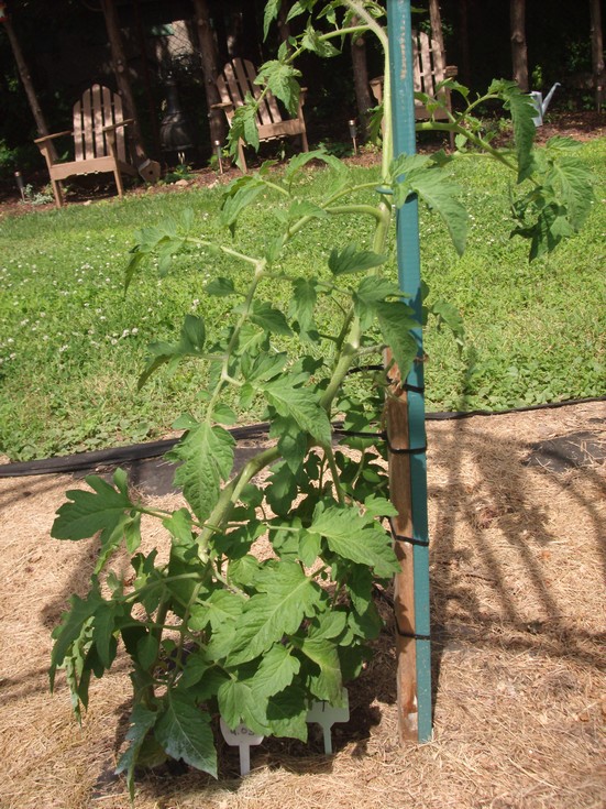 4.03 Diehl with tomato growing from two fused bloom set approx. June 14th. Plant pruned to single stem.