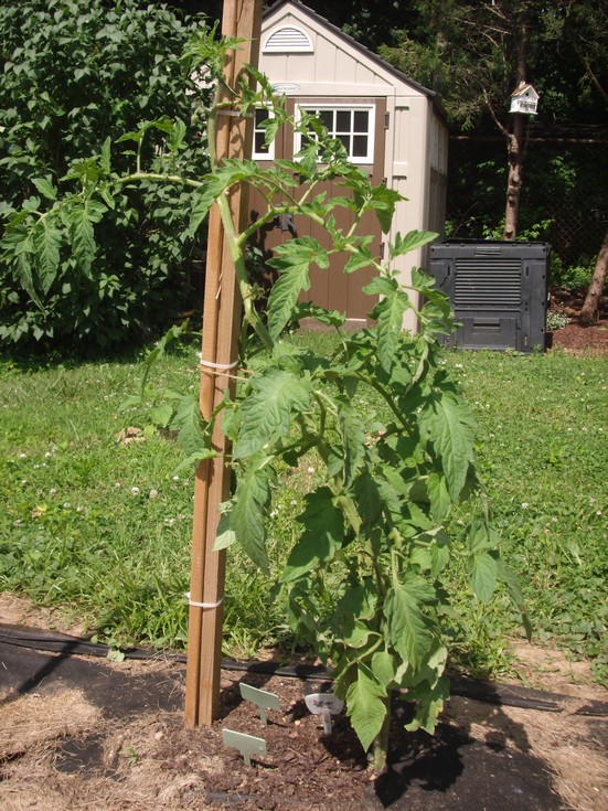 6.57 Boudyo with tomato growing from three fused bloom set approx. June 16th. Plant pruned to single stem.