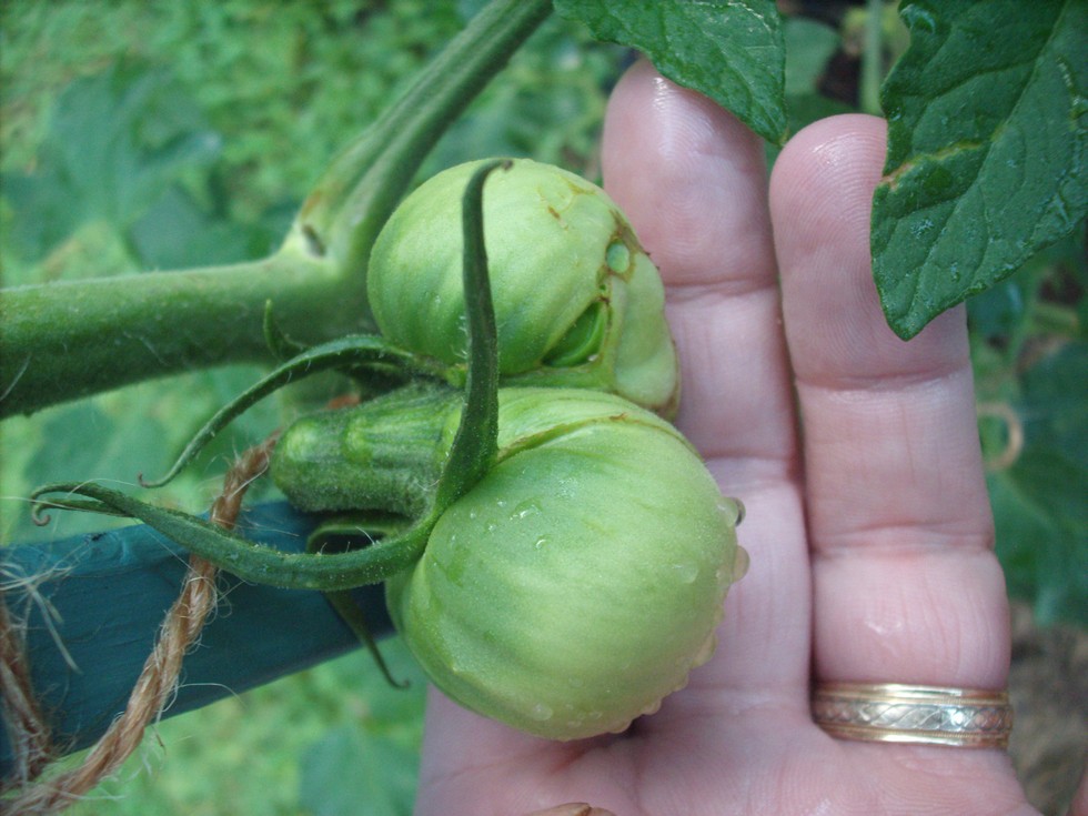 The physically largest tomato growing from a mega bloom at this time. It's the tomato from the three fused bloom on one of my own 4.03 Diehl plants (Mega Marv).