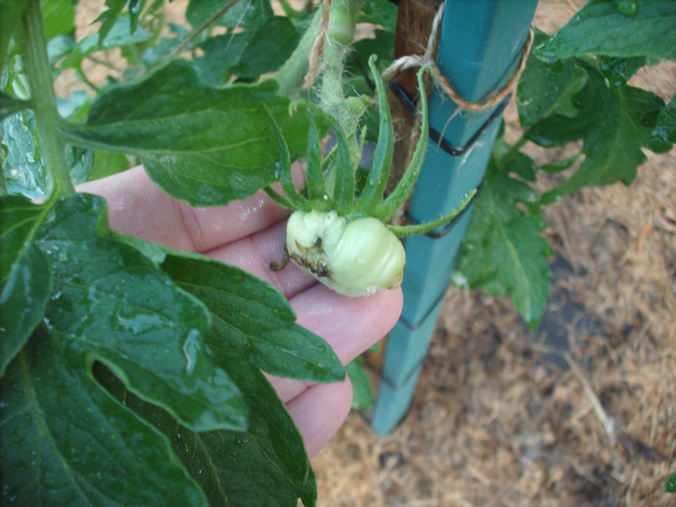 A tomato growing from a two fused bloom on another 4.03 Diehl plant (Mega Marv).