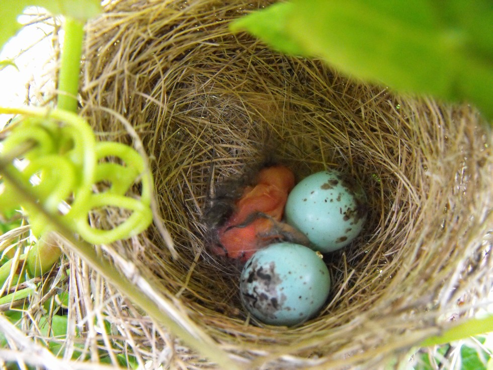 Last but not least on entries for today, This is a Jenny Wrens Nest (Common House Wren Possibly) in the grape vines. For the past 3 years this bird has always built her nest in the same place, a clutch of 3 eggs and they always hatch around the 4th of July. This on hatched at 7:30 am this morning on the 5th of July. The nest is 2.5 " across. Mom lets me get very close and she often flys & lands within 2 ft of me on the vines checking me out. I've put dead grass moths on leaves for her and she takes them with me right there..pretty cool.