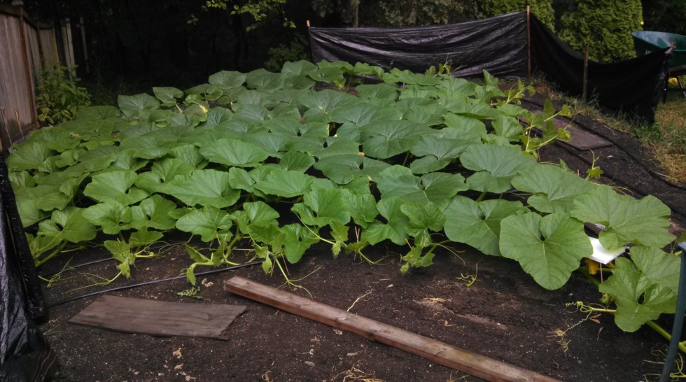 We've had absolutely torrential rain on and off all day. The pollination is under the styrofoam to the right. The plant layout is Christmas tree to the right (some of those secondaries will have to be terminated soon) and sort of trident/pitchfork on the left, with the secondaries recurving and running parallel with the main vine. Once it dries out tomorrow, I've got a ton of vine burying to do...still no females visible further down the main, but they're starting to pop up on several secondaries. Seriously crossing my fingers this pollination takes, since the plant will have completely filled out my patch within a week and a half. For some reason, I've always had this baseless idea that you should give your plant one or two set females to get it into pumpkin growing mode before keeping one further down the vine, but perhaps no choice here, ha!