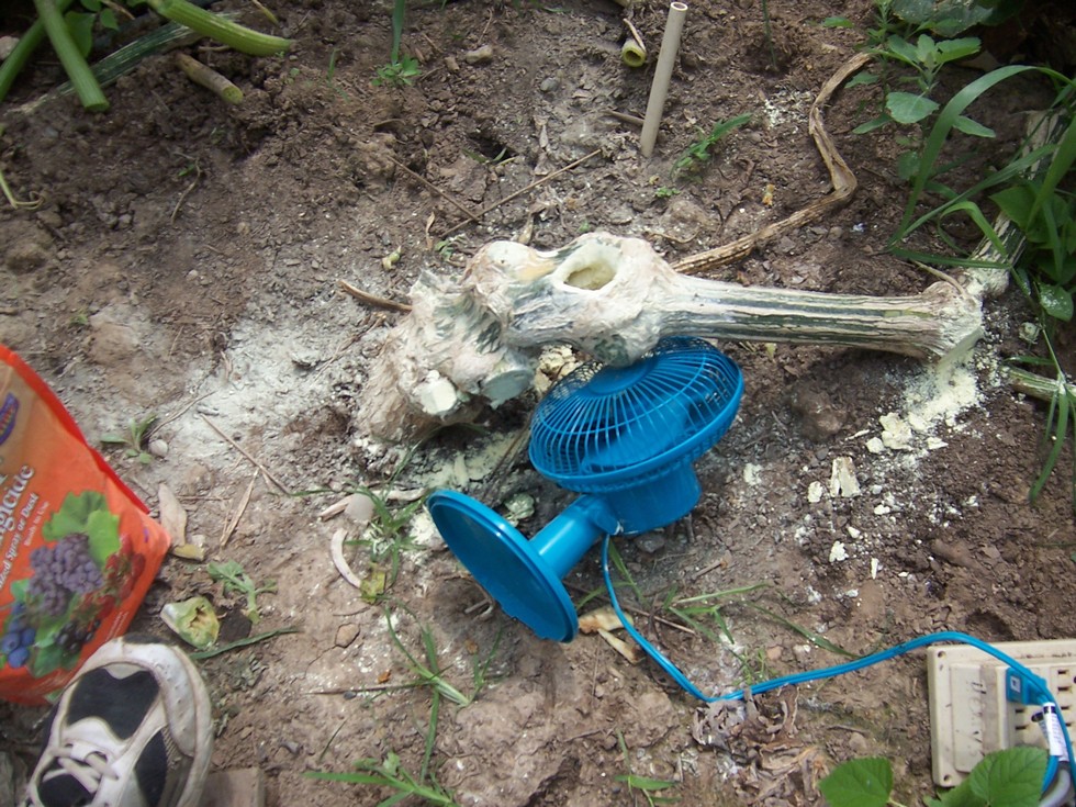 It is hot muggy and mostly cloudy today with a chance of storms, I will leave the fan on and cover with a table if it rains.