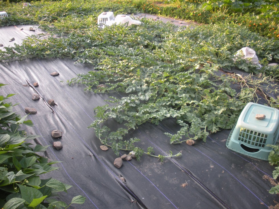 This is the giant melon patch. They are doing terrible this year. I never have had luck with the black plastic. I do so much better when I grow on soil.