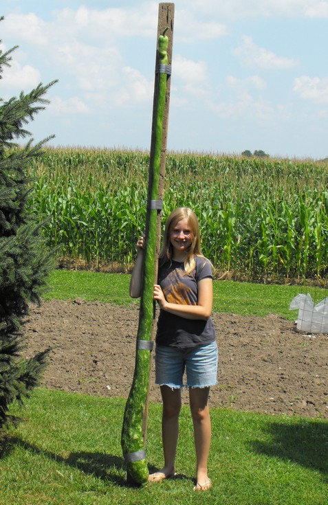 83 1/2" DeMars 1st long gourd of the 2014 Season is now the #1 unofficial Est 99.5" J. Young, 37 dap. There is much more pruned and trimmed plant behind another very fast growing LG so I wanted to get this one off to concentrate the energy to the #2 LG. Just a theory, I still have no clue what I'm doing. This one stayed at 99.5" for three days without any growth before removing it. In the basement it goes.