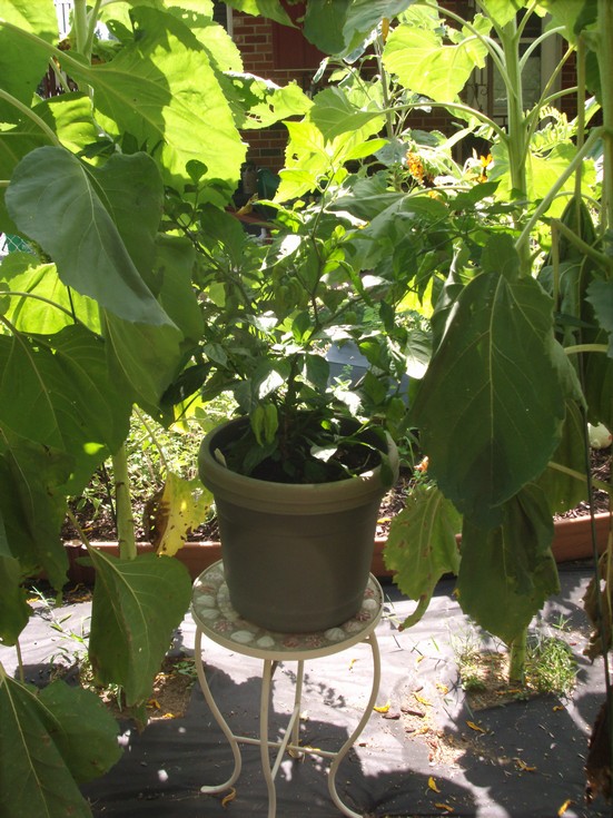 Here's a photo of the Ghost pepper plant sitting on the stand underneath the sunflowers.