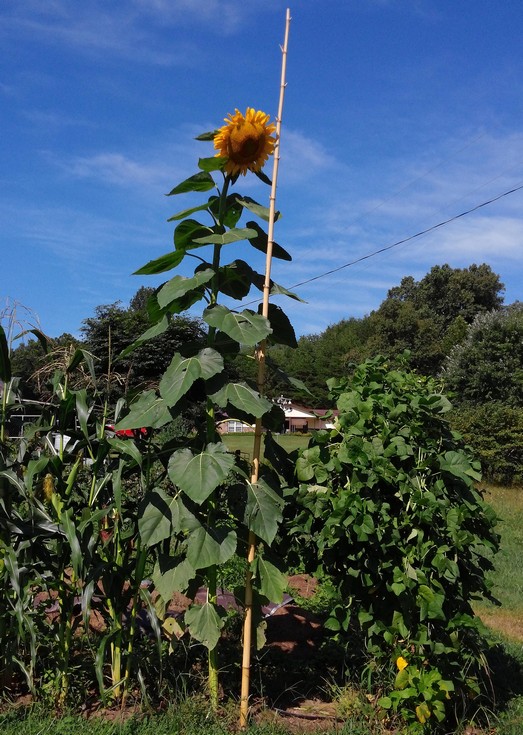 The tall sunflower Im growing for biggest head. This picture was taken on the 14th, by Saturday the head was bending over. So should I straighten up the head or just let it bend over? I have no idea. The bamboo that the stalk is tied to is about 15 feet tall. And next to the sunflower is some glass gem corn, cant wait for that to be ready to harvest.