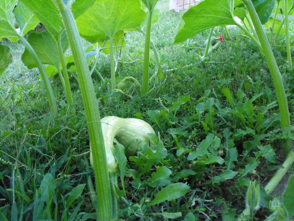 This is a Brown Cushaw Squash Plant. If you look down the vine you will see three fruits, yes that 3rd one is a 297 Kent growing off the end of the vine,lol. I grafted it at 10:00 pm on the 27th of Aug about 8 days ago. It has put on 3" on the circ, lol. For the 1st 3 days I kept a 3" gause bandage around the graft saturated so it wouldn't dry out. Am keeping the sun off of it too. I'm going to remove the grafting clams this coming weekend. Why do this? Why not, lol. I had three 297's on this one big plant with different approaches, two failed, this one kept.