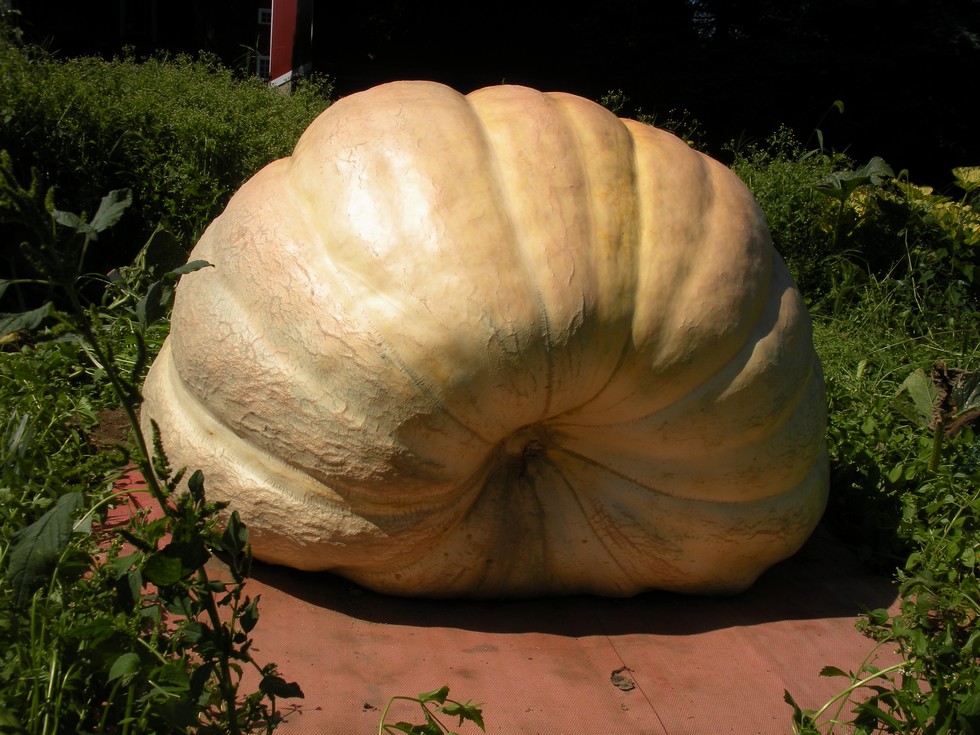 Blossom end shot of the 1766.5 DeBacco beast. She aint purty but It's not a beauty contest. This pumpkin is actually almost half green. Please go heavy, please go heavy!