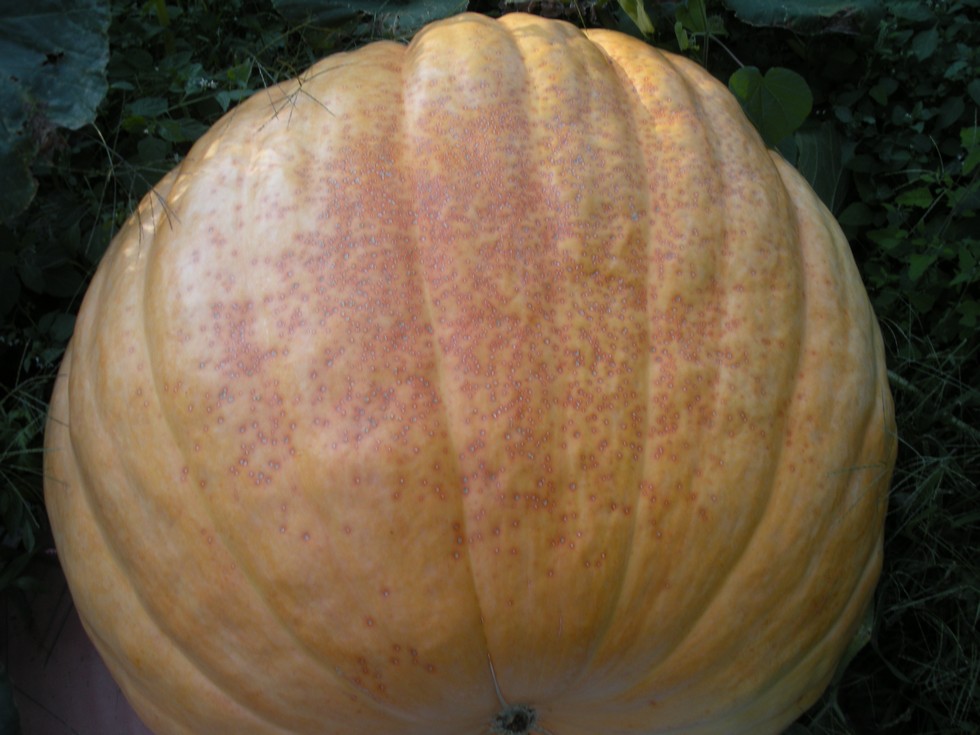 A shot of the 1224 Steil from the top. You can see the cuke beetle damage on the skin. This pumpkin would be a real nice looking pumpkin with out the spots.