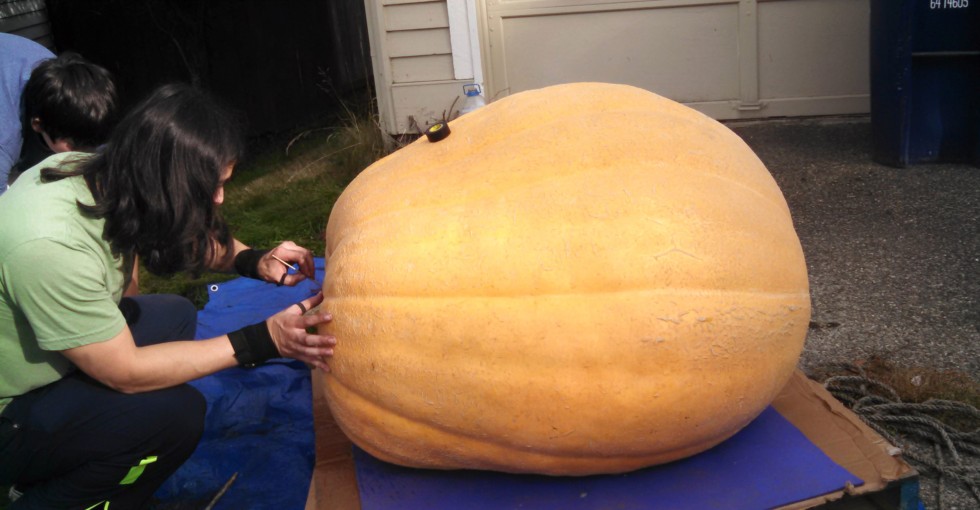 To my great surprise, a friend of my Dad's loaned me his truck for the Central Market Weigh-off on Saturday! I genuinely wasn't sure I'd make it up until late afternoon the day before. Anyway, upon finding I'd be able to go, I procured a pallet from a very nice store employee who asked me not to mention where I got it, ha, and set about the removal process. It turns out, 500lbs is a lot heavier than I'd thought; just tipping it onto its side to clear the bottom was an exercise in hernia-risk. With the help of my brother, we tipped it up, dug out a pallet-sized area underneath the pumpkin, dropped the pallet in the hole and lowered the pumpkin onto it. My wrists have taken a beating from weight-lifting and didn't fare well moving the pumpkin, hence the wrist wraps. Here I am cleaning the sulfer paste out of the stem split.