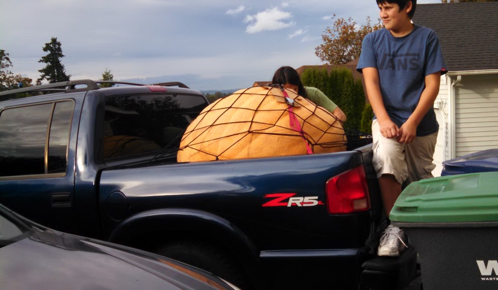 We tried everything to drag the pumpkin to the front driveway, but it wouldn't budge even an inch, so I managed to drive an old Buick LeSabre (with, honest to goodness, an inch of clearance on each side) between my house and the fence, into the backyard, where I tied the pallet to the frame and slowly backed it out. Took a while, with much wheel spin, but I was finally able to pull the pumpkin onto the cement! I think a tripod structure and lifting ring are absolute musts for next year, because this was just stupidly complicated. Anyway, with the help of several neighbors and my Dad, we lifted the pallet into the truck and strapped 'er down.