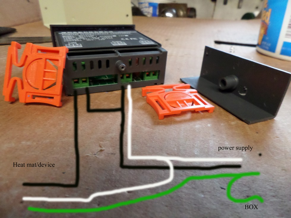 This is the wiring for a single relay type (to control one device) notice the 3 blocks for connecting the wires, the right block is for the probe, the middle is for power to the thermostat the white and black wire can be switched it doesn't matter.