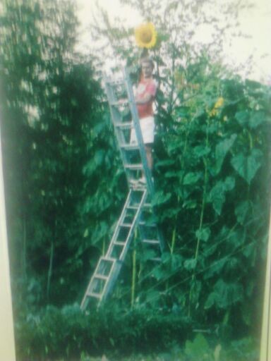 My 16'-6" sunflower in 2002. This was before all the deer, squirrels, ground hogs found out how good they tasted.
