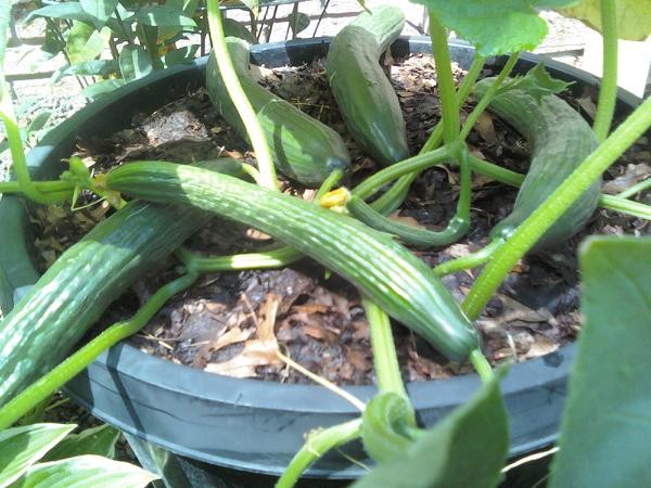 Here is an all femame seedless cucumber that i grew in a pot last summer, this was just the first 5 cucumbers out of the 16 this one plant grew before spider might damaged it buy early august.