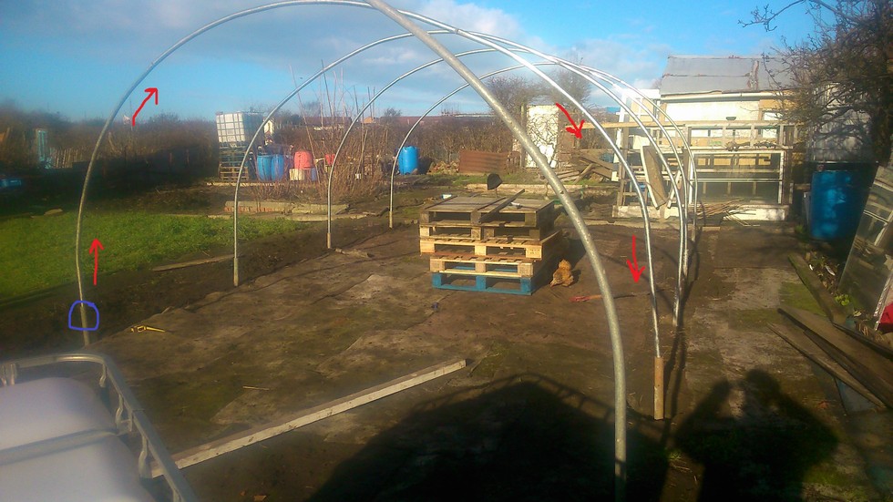 The ground tube circled is the one that was levered out of position and will be corrected (not as obvious in this picture). The hoop is also out of line and needs to be moved in the direction of the arrow. I'm glad I called it a day as it was not so obvious at the time.