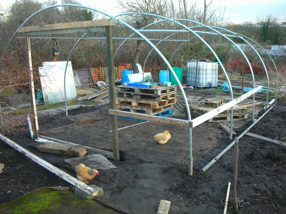 It's coming along nicely. The hoops are not exact as again, doing it with just one person has been a nightmare at times. Also, I just noticed that the tunnel has not followed the natural slope of the patch and hence one side is considerably higher. I would have to shift a load of soil to hide the mistake.