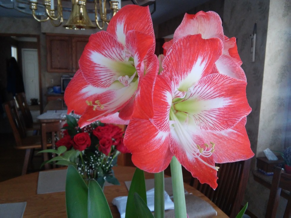 Here is an amarylls plant that is blooming for the first time ! These were side shoot bulbs that came from a bigger parent bulb that i seperated two years ago. No wonder the bulbs cost $7-$12 they take many years to grow before rhey get their first blooms.