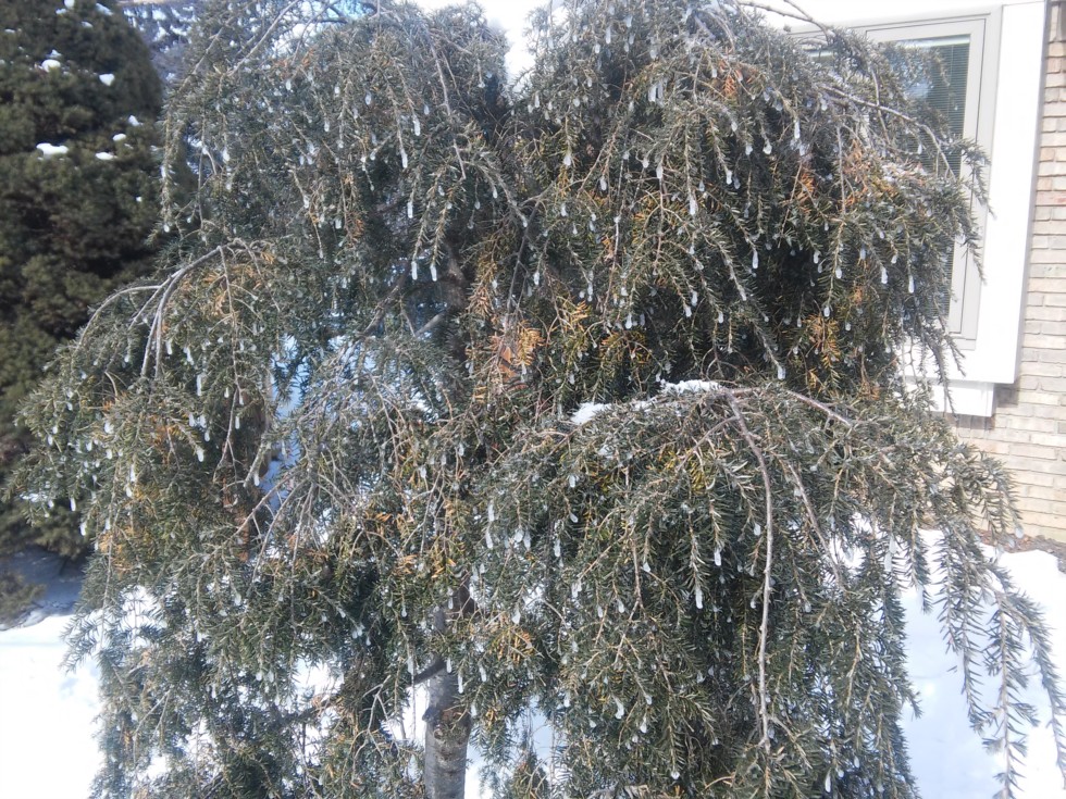 I decided to try spraying water on my weeping hemlock to have a layer of ice to coat the needles and branches. Last year i lost about 75% of the needles to the extreme cold and so far it looks much better than last year. You can see that their is some mild burning so i thought that iwould try this out to see if it will work !