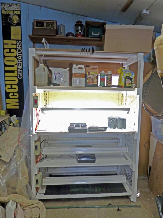 Testing out new germination stand, the wife gets two shelves and I get one plus there is an extra one, the wife already has eyes on it. The temp in this room is 50F when I cover the front with a blanket its 86 inside.