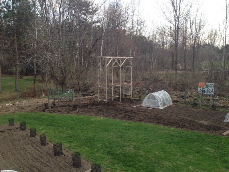 We moved the shady trellis about 15 feet towards the center of the old patch. This was quite a project seeing it is made with 16 foot 2x4's. My two boys helped Kerry and I with the wobbly move. Hopefully this will add a couple hours of sun to the long gourd!