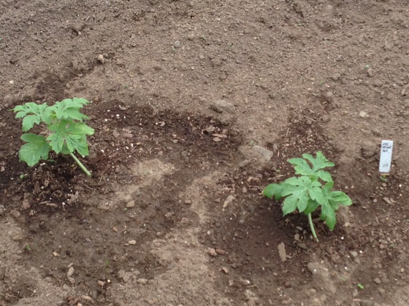 The melons are growing well with the 177 Berry on the left and 255 Mitchell on the right.