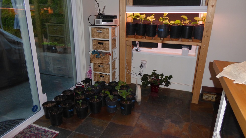 The germination factory. The bulk of these plants were started for my neighbors. A multi generational family of farmers who are having their own pumpkin growing contest. I have germinated 24 Chan 1043's so that they can show off their green thumbs. Should be interesting to say the least! The rest of the plants are for friends who are recreational gardeners and who want a little fun in their backyards. For those I germinated Dixon 384's, a very bright orange shiny pumpkin. Already we can see the difference in the very shiny green leaves vs. the dull green for the giants.