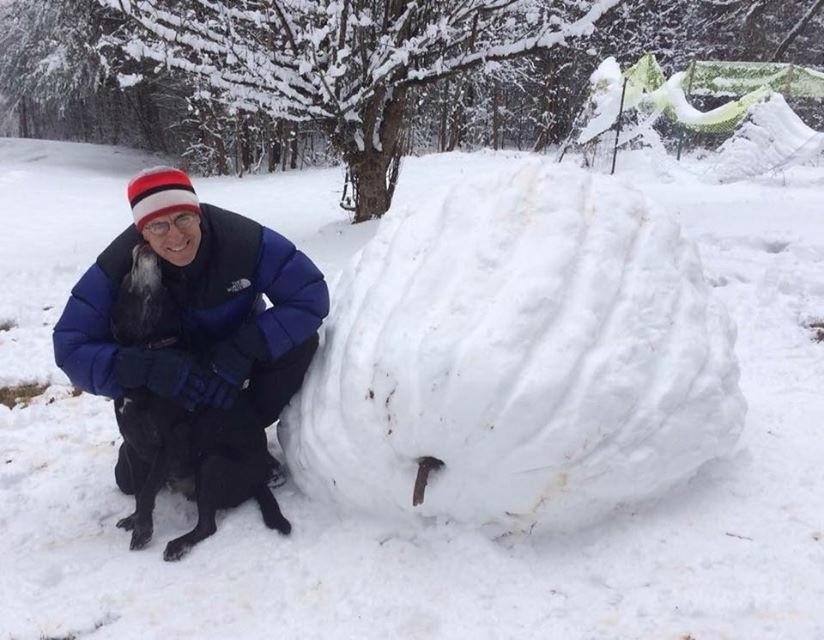 I have hesitated to start a diary this year because I haven't known exactly where to start. My brother and growing partner, Bruce lost his dog, Dakota (pictured) who was more like a family member than a pet. They ran tens of thousands of miles together on trails. They truly had a special bond. Dakota lost his fight with cancer this spring and our father also passed in May from cancer. We hope the pumpkin patch will be good therapy for us this year. You know you are a true pumpkin fanatic when you build a pumpkin instead of a snow man. Bruce and Dakota are in the picture with the snow pumpkin. Oh yeah, he didn't just make a snow pumpkin, but also taped it and estimated its weight at just over 1500 lbs. I hope that is an omen.