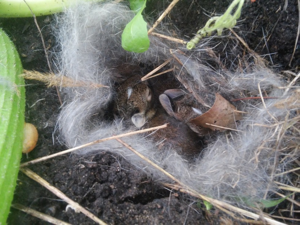 I thought by now that these baby rabbits would have been gone, they made a nest at the bace of one of my pumpkin plants and i have been waiting for them to leave their nest for two weeks so that i can close up my bug screen house ! But they seem to like it in their for protection i think ? As long as they don't cause any damage i will let them leave when they are ready. They are cute as long as they don't eat my pumpkin ???