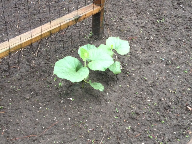 129 Young long gourd is getting closer to trellis. Not sure we will get a long gourd from it this late. We got a low of 39 Degrees Saturday morning. Our highs have been low 70's and too wet. We will not give up though and are just trying to keep plants healthy!
