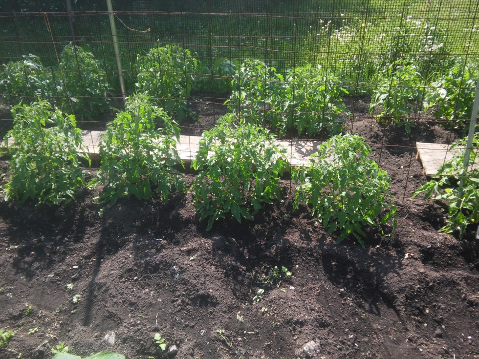 Here is how i planted my Compitition tomates 2 feet apart along a wire mesh fence. I have 30 plants. So far i like the idea of planting later. I think that you get a stronger plant with a beter root system when that first megabloom developes.