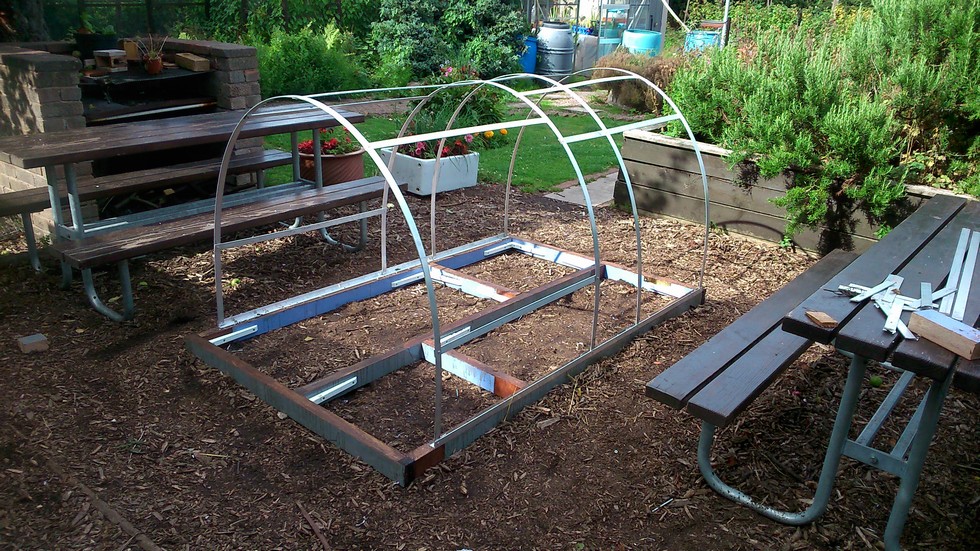 1. Base complete 2. Aluminium corner trim (x2) screwed to each side 3. Aluminium hoops (x4) riveted to trim 4. Hoops riveted together with support strips