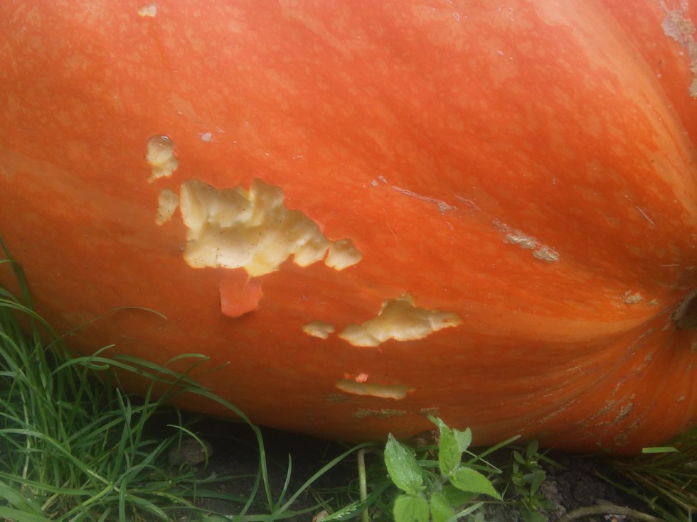 Looks like a groundhog is tasting my big pumpkin !!! I hope that this doesnt start causing a rot now ? So close to the finnish !!!