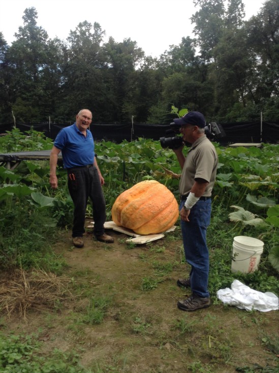 My old growing partner Gail Newsome is having a good year, so we took the reporter to visit his patch. I like this picture because it captures Gail's pure unadulterated joy when he is in a pumpkin patch. Gail in a pumpkin patch is like Pop-Eye eating spinach. Gail is 71, but he truly does become a kid again when he's in his patch.