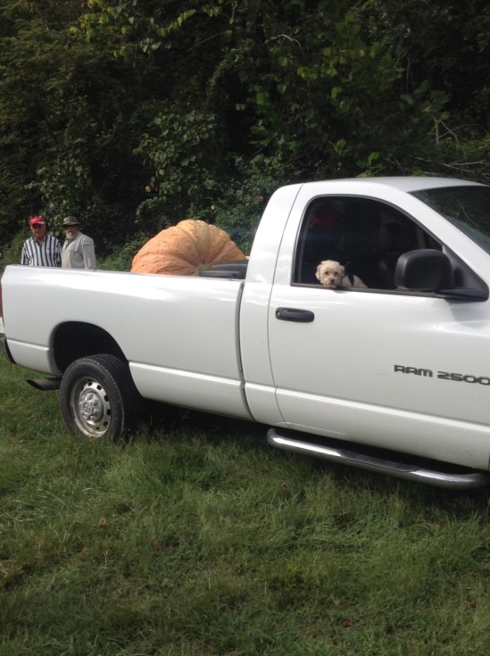 CL and Marshall Whitt in the background with the pumpkin on the truck. Marshall and his wife, Tammy own the land Gail grows on. They have a beautiful place with a breathtaking panoramic view of the Blue Ridge Mountains. The little fellow poking his head out of the truck is Gail's constant patch companion, Cody.