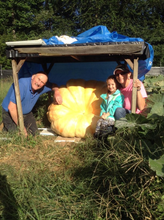 Gail with Tammy Whitt and her grand-daughter and one of his pumpkins. If the cool nights don't slow it down too much, it could be the biggest Gail has ever grown.