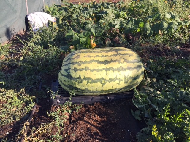 This is the 267 Edwards x 297 Kent. Both melons are neck and neck for the patch biggest. Our temps are in the 30's at night now so there won't be much growing left. Hopefully this big fat one yields a new PB for me.