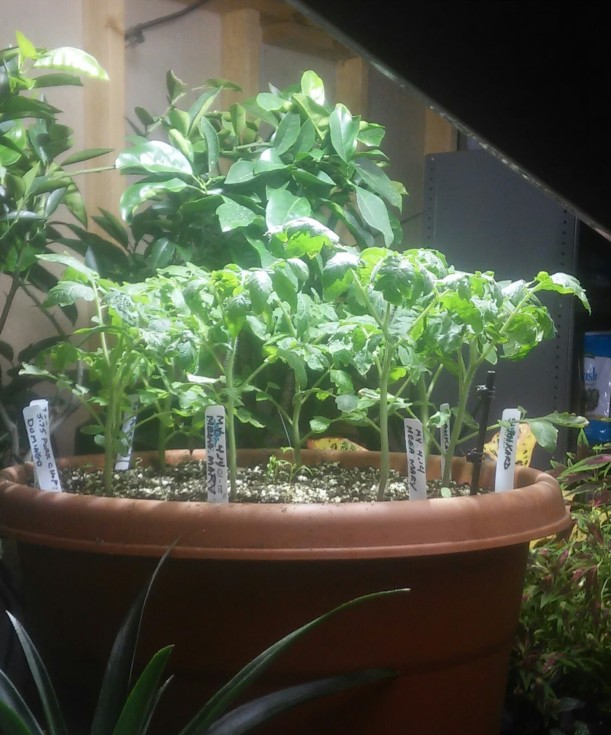 since i am short on space i decided to plant them all in a 10 gallon pot i hope that i don't regret it later, i guess we will find out. im not worried about size, just trying to make crosses. size is only a bonus.if you look close, i also put carrotts in the middle so they will take over when the tomatos are done.