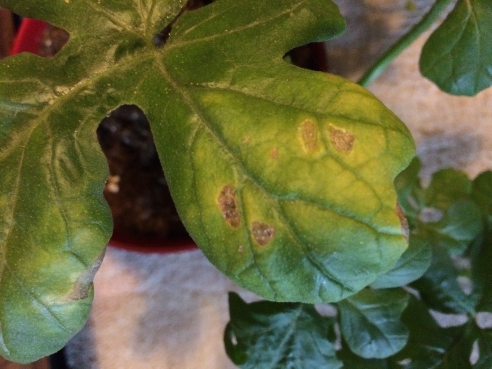 Note the yellowing of the leaf and brown spots. Started on one leaf and now has spread through plant.