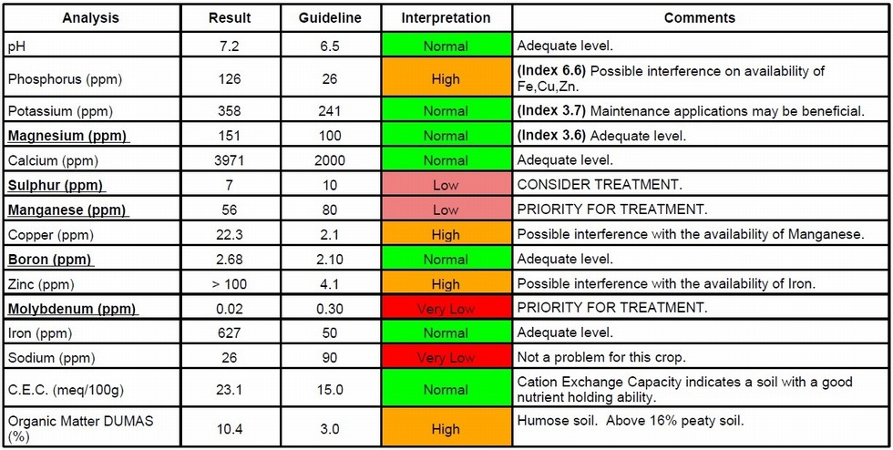 Here's the soil report for the top patch which I'm fairly happy with. The pH was at 7.5 last year so getting it down to 7.2 is heading in the right direction. Boron levels are up to where they should be but Magnesium is clearly the elephant in the room. Apart from some ammendments I'll be looking to supplement Mg during the season through the watering system.
